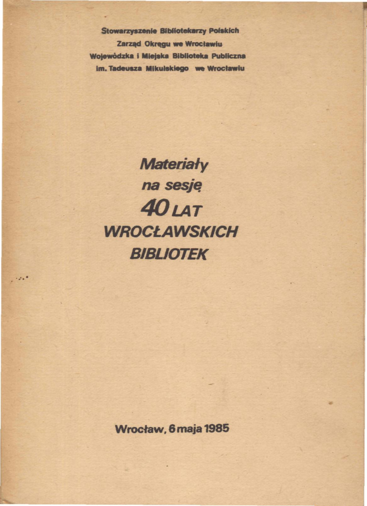 Teka zawiera: 1. 40 lat bibliotek naukowych we Wrocławiu / S.Kubów 2. Służby informacji naukowej, technicznej, ekonomi- cznej w czterdziestolecie odzyskania Wrocławia / T.Górecki 3. Stowarzyszenie Bibliotekarzy Polskich we Wrocławiu w 40-leciu / A.Janik 4. 40 lat bibliotek publicznych w województwie wroc- ławskim / J.Bernard