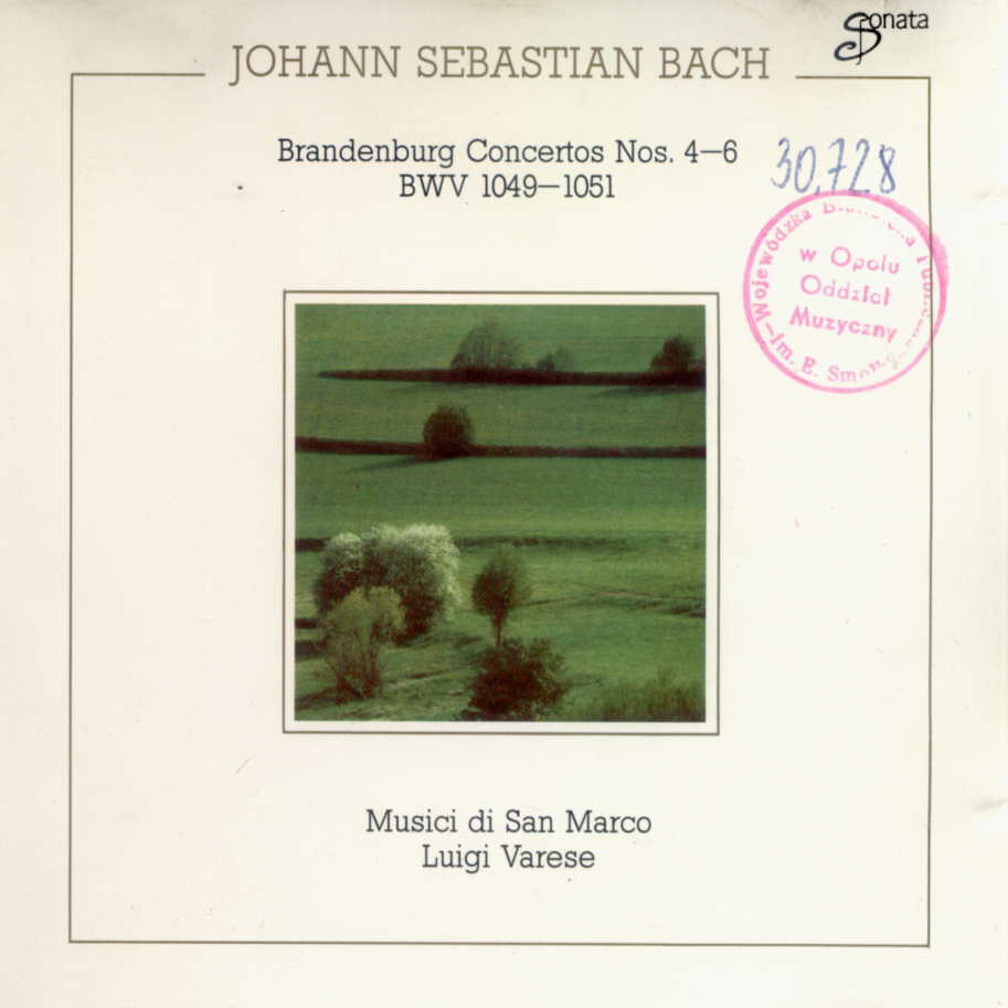 Brandenburg Concertos Nos.4-6 BWV 1049-1051 / Johann Sebastian Bach ; ork. Musici di San Marco ; dyr. Luigi Varese. - Niemcy : Sonata, [b.r.]. - 1 płyta audio (CD) (59 min 11 s) : zapis cyfrowy, stereo ; 12 cm.