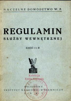 Regulamin służby wewnętrznej. Cz. 1 i 2 / Naczelne Dowództwo W. P. - [Wyd. 2]. - [Lublin] : Wojskowy Instytut Wydawniczy, 1945 (Jelenia Góra : Główna Drukarnia Wojskowa). - 59 s. ; 14 cm.