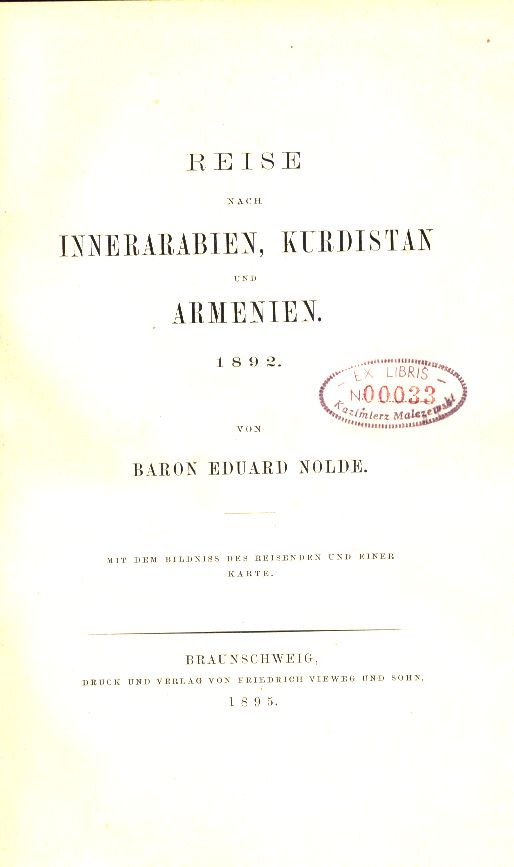 Reise nach Innerarabien, Kurdistan und Armenien : 1892 / von Baron Eduard Nolde. - Braunschweig : Druck und Verlag von Friedrich Vieweg und Sohn, 1895. - XV, 272 strony, [1] karta złożona : mapa, portret ; 23 cm.