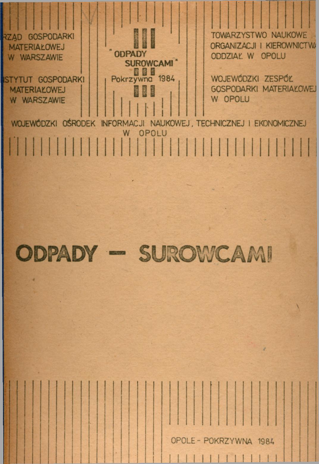Baranowski Zenon. Miejsce i rola surowców wtórnych oraz produktów ubocznych przemysłu spozywczego w gospodarce województwa opolskiego Kühnemann Adolf (1934-2017). Miejsce i rola surowców wtórnych oraz produktów ubocznych przemysłu spozywczego w gospodarce województwa opolskiego Ważyński Kazimierz. Ekonomiczno-organizacyjne i legislacyjne podstawy efektywnego wykorzystania surowców wtórnych w gospodarce narodowej Janicki Mieczysław. Węzłowe problemy zagospodarowania odpadów przemysłu spożywczego w aspekcie potrzeb krajowych i działania zasad reformy gospodarczej Imbs Bogusław (1925-2012). Rola badań naukowych w racjonalizacji wykorzystania odpadów przetwórczych w Polsce i innych krajach Makara Henryk. Rozwój technologii bezodpadowych w Polsce i innych krajach jako efektywnych form oszczędności surowców i ochrony środowiska Grudziński Jerzy. Systemy motywacyjne oraz efekty ekonomiczne wynikające z doświadczeń w racjonalnym zagospodarowaniu odpadów przemysłu mięsnego Kroll Alojzy. Systemy motywacyjne oraz efekty ekonomiczne wynikające z doświadczeń w racjonalnym zagospodarowaniu odpadów przemysłu mięsnego Pawlik Stefan. Formy i efekty zagospodarowania produktów ubocznych przemysłu mleczarskiego ze szczególnym uwzględnieniem ochrony środowiska naturalnego Pietrowska Irena. Przerób odpadów drobiarskich na białkowo-tłuszczowy koncentrat paszowy Chmielewski Antoni. Efekty ekonomiczne w zagospodarowaniu odpadów w Nadodrzańskich Zakładach Przemysłu Tłuszczowego w Brzegu Garbowski Zbigniew. Analiza przesięwzięć organizacyjno-technicznych oraz efektów finansowych w zagospodarowaniu odpadów na przykładzie Opolskich Zakładów Koncentratów Spożywczych "OVITA" w Opolu Koch Marian. Efektywność zagospodarowania produktów ubocznych w cukrowniach makroregionu południowego Wesołowski Bronisław. Stan i perspektywy wykorzystania odpadów przemysłu spożywczego w rzemiośle w aspekcie przepisów legislacyjno-finansowych Perek Zenon. Gospodarka surowcami odpadowymi w przemyśle piwowarskim województwa opolskiego ze szczególnym uwzględnieniem procesów substytucyjnych i efektów ekonomicznych Pendlowski Bronisław. Gospodarka surowcami odpadowymi w przemyśle piwowarskim województwa opolskiego ze szczególnym uwzględnieniem procesów substytucyjnych i efektów ekonomicznych Borowski Andrzej. Formy zagospodarowania surowców odpadowych pochodzenia zwierzęcego na cele paszowe w warunkach działania reformy gospodarczej Holzapfel Georg. Doświadczenia i efekty wykorzystania odpadów przemysłu spożywczego w Niemieckiej Republice Demokratycznej Strzelecki Włodzimierz. Ekonomiczno-organizacyjne podstawy efektywnego zagospodarowania niemetalicznych surowców wtórnych