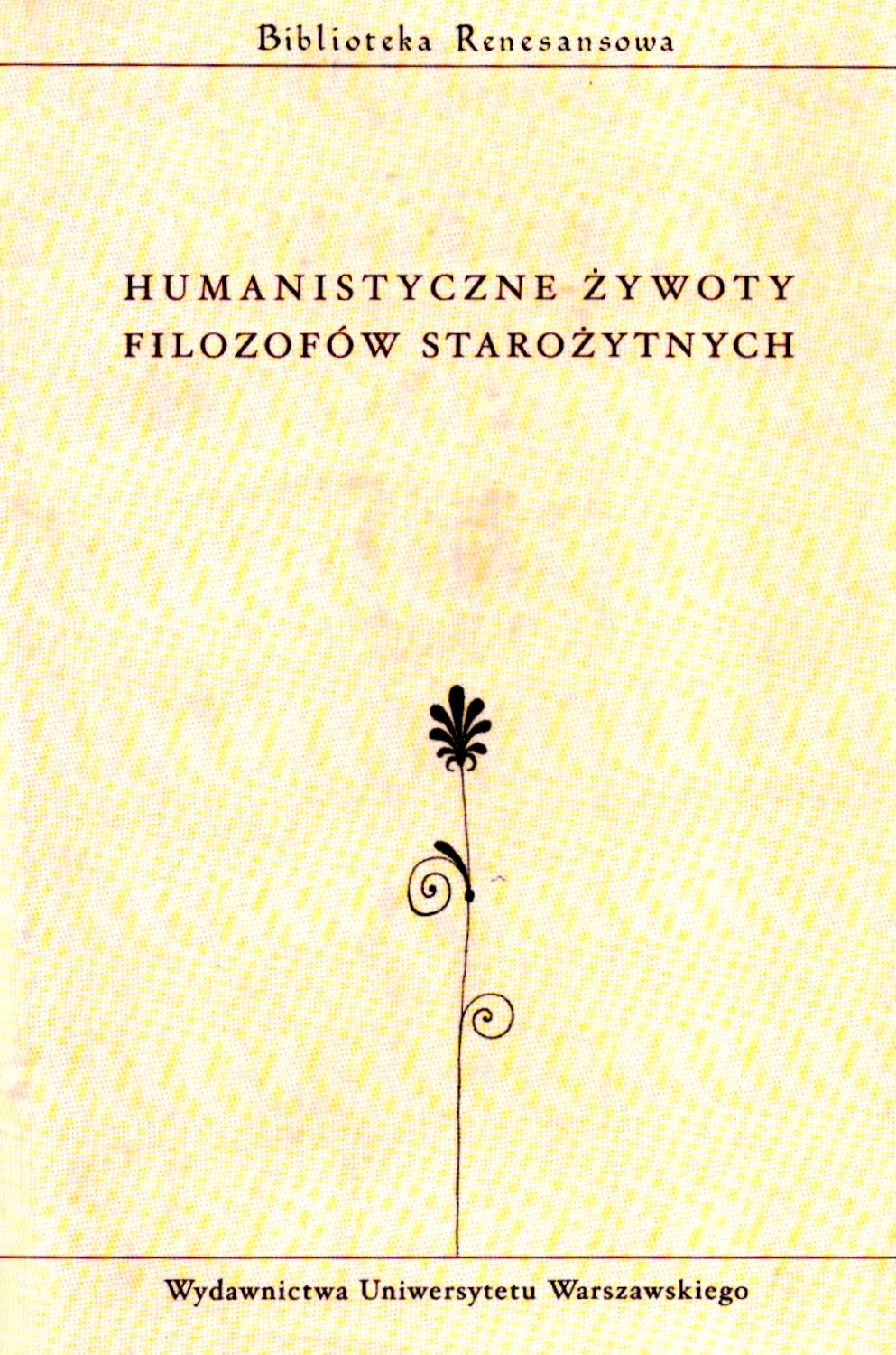Zawiera: Żywot Cycerona / Leonardo Bruni Aretino ; przekł., wstęp i koment. Krzysztof Rzepkowski. Żywot Arystotelesa / Leonardo Bruni Aretino ; przekł., wstęp i koment. Włodzimierz Olszaniec. Żywot Platona / Guarino Guarini ; przekł., wstęp i koment. Tomasz Płóciennik. Żywot Sokratesa / Giannozzo Manetti ; przekł., wstęp i koment. Anna Skolimowska. Żywot Seneki / Giannozzo Manetti ; przekł., wstęp i koment. Maciej Staniszewski. Żywot Platona / Marsilio Ficino ; przekł., wstęp i koment. Mikołaj Olszewski.