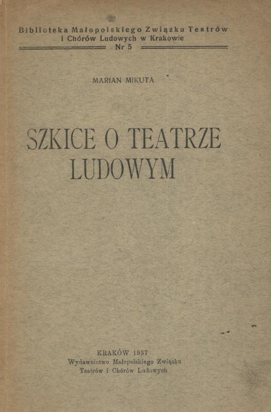 Szkice o teatrze ludowym / Marian Mikuta. - Kraków : Wydawnictwo Małopolskiego Związku Teatrów i Chórów Ludowych, 1937 (Tarnów : Drukarnia Ludwika Styrny). - 73, [1] s. ; 22 cm.