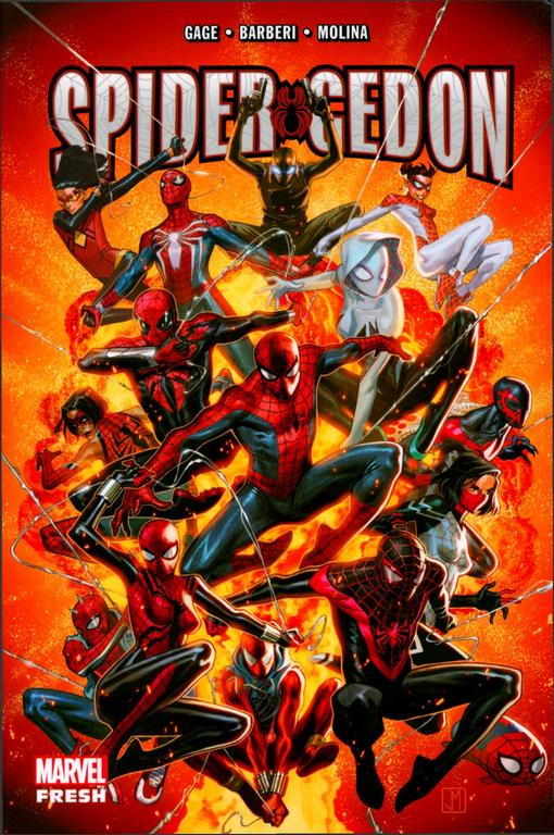 Zawiera: Edge of Spider-geddon. #1-4 / scenariusz Jed MacKay (#1), Lonnie Nadler i Zac Thompson (#2), Jason Latour (#3) oraz Aaron Kuder (#4) ; rysunki Gerardo Sandoval (#1), Alberto Alburquerque (#2), Tonči Zonjić i Brahm Revel (#3) oraz Aaron Kuder i Will Robson (#4) ; tusz w zeszycie #4 Craig Yeung i Will Robson ; kolory Brian Reber (#1), Tríona Farrell (#2), Tonči Zonjić i Ian Herring (#3), oraz Andres Mossa (#4) ; okładki Gerardo Sandoval (#1), Jake Wyatt (#2), Tonči Zonjić i Brahm Revel (#3) oraz Aaron Kuder i Dean White (#4). Superior octopus. #1 / scenariusz Christos Gage ; rysunki Mike Hawthorne ; tusz Wade von Grawbadger ; kolory Jordie Bellaire ; okładki Travis Charest. Zbiórka / scenariusz Jed MacKay ; rysunki Javier Garrón ; kolory Israel Silva. Spider-geddon. #0 / scenariusz Christos Gage ; rysunki, kolory i okładka Clayton Crain. Spider-geddon. #1-5 / scenaruisz Christos Gage ; rysunki Jorge Molina (#1-2, #4-5), Carlo Barberi (#3-5), Todd Nauck (#3) oraz Stefano Caselli i Joey Vazquez (#5) ; tusz Jorge Molina (#1), Jay Leisten (#2, #4-5), Craig Yeung (#2), Roberto Poggi (#2), José Marzan Jr. (#3-5), Todd Nauck (#3) oraz Stefano Caselli i Joey Vazquez (#5) ; kolory David Curiel ; okładki Jorge Molina. Vault of Spiders. #1-2 / scenariusz Jed MacKay, Cullen Bunn, Nilah Magruder, James Asmus, Ryan North i Geoffrey Thorne ; rysunki Scott Koblish, Javier Pulido, Sheldon Vella, Alberto Alburquerque, Juan Gedeon, Mark Bagley, Andrew Hennessy, David A. Williams i Todd Harris ; kolory Andres Mossa, Muntsa Vicente, Andrew Crossley i Chris Sotomayor ; okładki Giuseppe Camuncoli i Dean White.