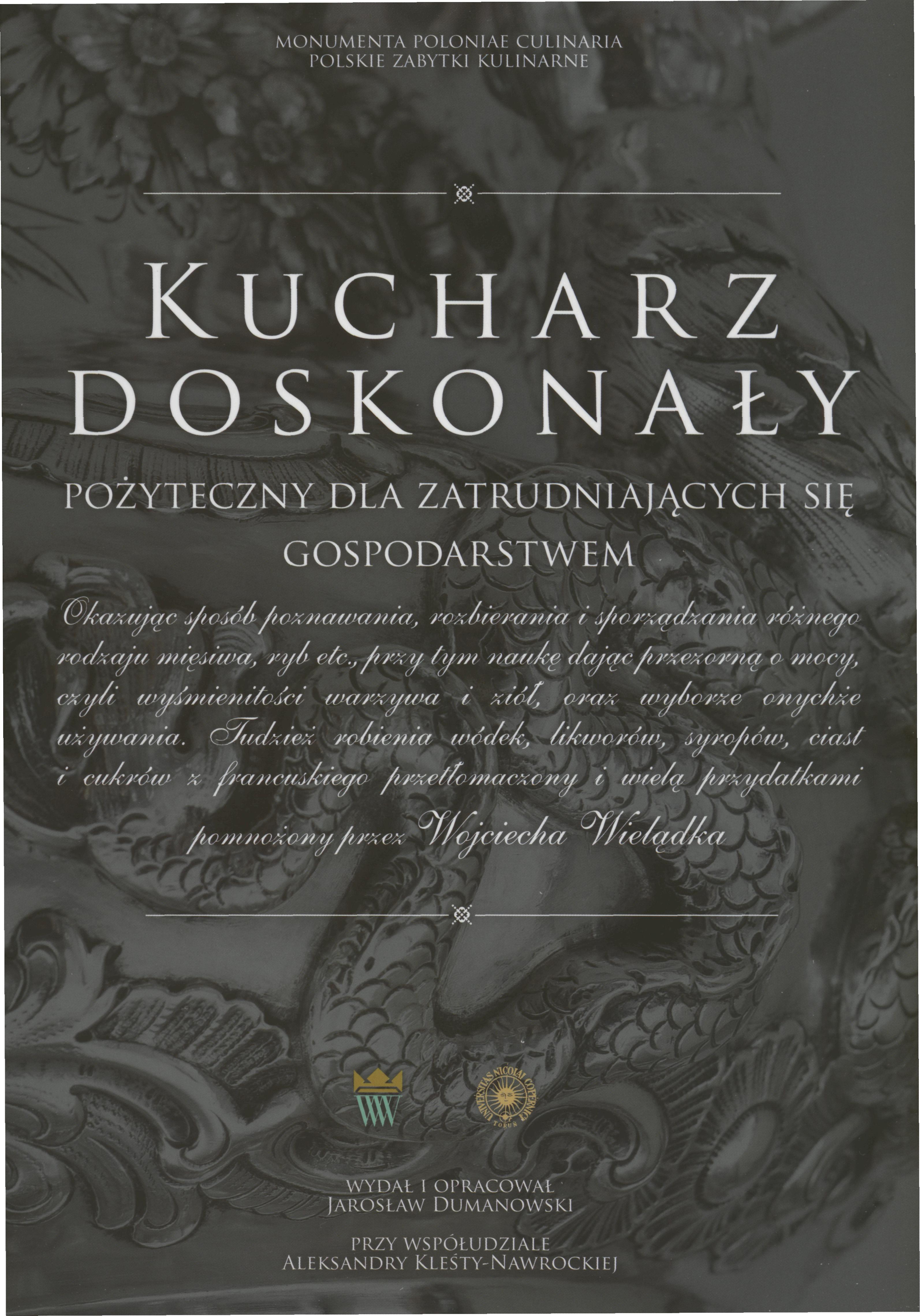 "Opublikowany w 1783 roku Kucharz doskonały to druga wydana drukiem polska książka kucharska. Styl Wojciecha Wielądki i jego opis kuchni różni się bardzo od Compendium ferculorum, słynnego dzieła Stanisława Czernieckiego, kuchmistrza rodu Lubomirskich i niedawno odkrytej Mody bardzo dobrej smażenia różnych konfektów, spisanej w latach 80. XVII wieku przez anonimowego kucharza związanego z dworem Radziwiłłów. Książka Wojciecha Wielądki to skrócone i uproszczone tłumaczenie francuskiej Cuisinie're bourgeoise (Kucharki mieszczańskiej). Piszący głównie dla czytelników szlacheckich Wielądko starał się ukryć ten fakt i oryginalny tytuł zastąpił świetnie brzmiącym Kucharzem doskonałym. Nowy tytuł docenił Adam Mickiewicz, który powołał się na to dzieło w Panu Tadeuszu. Wieszcz miał jednak na myśli przepis z wydanego sto lat wcześniej Compendium ferculorum... Pozornie prosty i zrozumiały Kucharz doskonały kryje w sobie wiele tajemnic. Zapraszamy do lektury i śledzenia perypetii Wojciecha Wielądki: chudego literata, który ułożył użyteczną i bardzo popularną książkę kucharską." (Jarosław Dumanowski, prof. Uniwersytetu Mikołaja Kopernika)