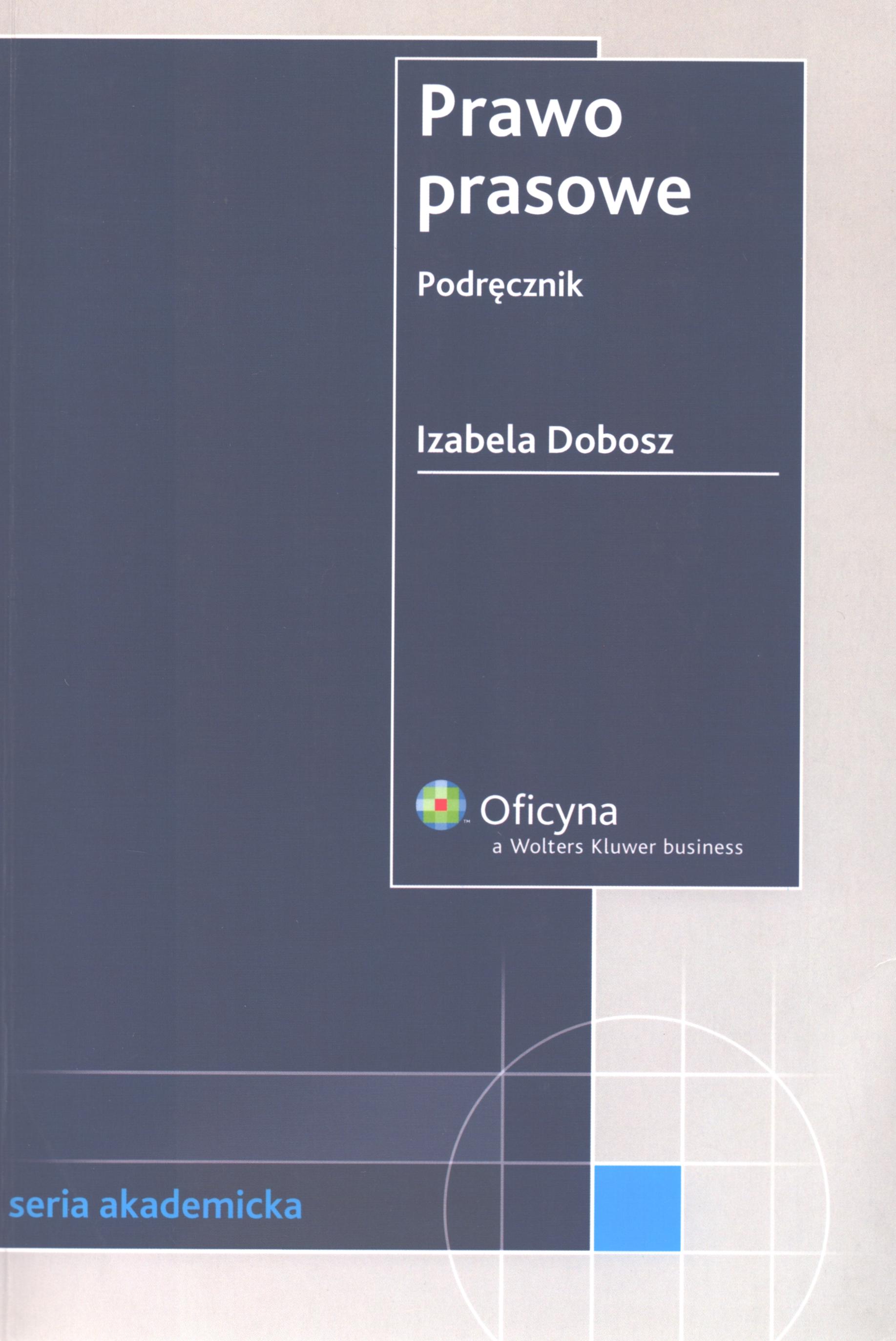 Prawo prasowe : podręcznik / Izabela Dobosz. - Stan prawny na 1 października 2006 r. - Warszawa : Oficyna Wolters Kluwer Polska, cop.2006. - 271 s. ; 24 cm.