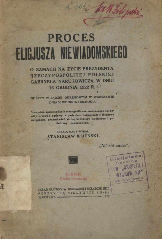 Książeczkę tę, bardzo szczegółową, mającą charakter drobiazgowej relacji z sali sądowej, wydano dwa razy tylko. Autor zaś robił w niej wszystko, by przekonać czytelników jak niezwykłym człowiekiem był Niewiadomski, który oczywiście ponosi całą winę za śmierć prezydenta Narutowicza. Tak się jednak składa, że jak ktoś jest prawnikiem i pisze reportaż z sądu, nie może omijać faktów, o których trąbią gazety i nie może udawać, że czegoś nie ma, skoro właśnie się ujawniło. Książka mecenasa Kijeńskiego, niepostrzeżenie więc dla niego samego, zamieniła się w demaskację. I świadomi tego ludzie nie dopuścili do tego, by wydano ją później. Ukazała się dwa razy po procesie i potem już wcale. [...] Trudno doprawdy dociec, dlaczego wydawnictwo tak istotne dla historii Polski, dotyczące tak ważnego i bez przerwy przypominanego wydarzenia, nie doczekało się krytycznych opracowań historyków prawa. To niezwykłe. Ja, rzecz oczywista, także takiego opracowania nie zamieściłem. Dołączyłem za to do tej książki wstęp, który Eligiusz Niewiadomski napisał do swojej monumentalnej pracy zatytułowanej „Sztuka na tle jej dziejów”. To jest tekst, którego nie powstydziłbym się żaden współczesny historyk sztuki. Dopisałem do niego swój, krytyczny wstęp, unikając jednak jakichkolwiek oskarżeń.