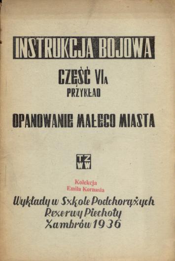 Instrukcja bojowa : wykłady w Szkole Podchor. Rezerwy Piechoty. Cz. 6a, (Przykład): opanowanie małego miasta. - Zambrów [i.e. Warszawa : Komenda Główna AK], 1943 ([Warszawa] : TWZW [Tajne Wojskowe Zakłady Wydawnicze W-2, W-5, W-9]). - 27, [1] s., [6] k. tabl. złoż. ; 18 cm.