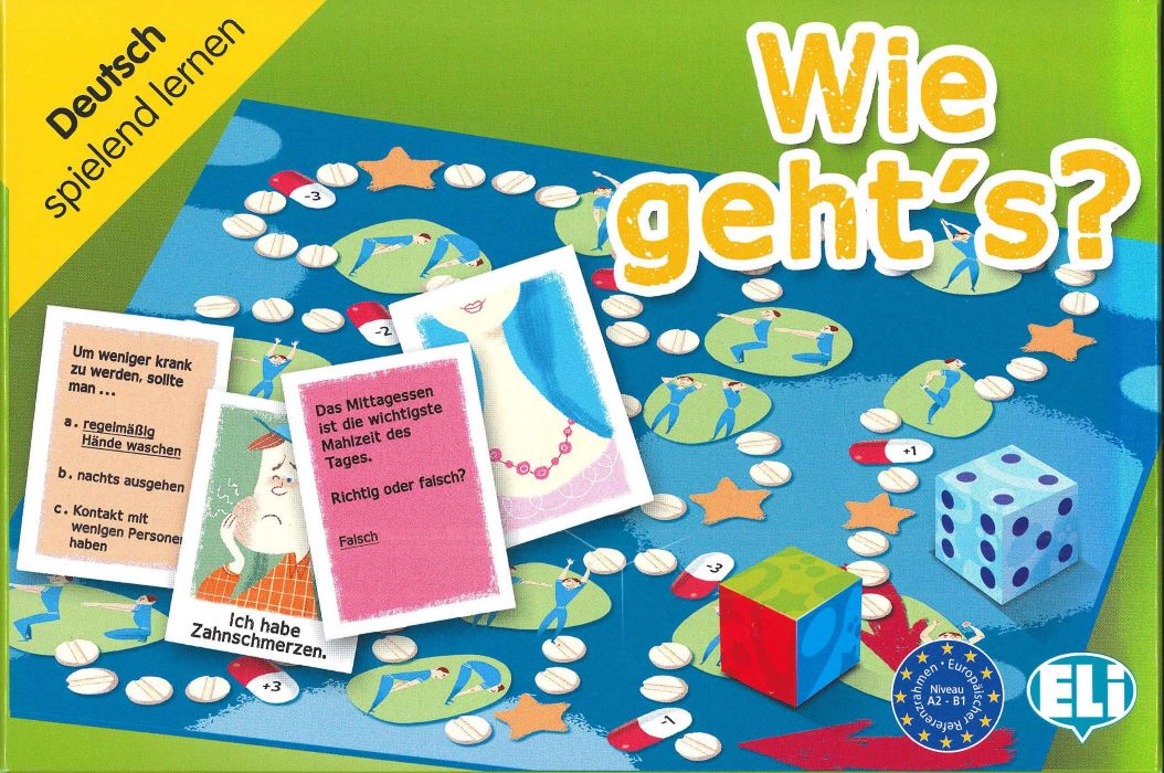 Wie geht's? : [ein Spielplan, ein Zahlenwürfel, ein Farbwürfel, 132 in sechs Kategorien aufgeteilte Spielkarten, Anleitung und Vorschläge] - Recanati : ELI srl, 2016. - 1 pudełko : 1 plansza do gry, 132 karty, 2 kostki do gry ; 21.5 cm x 14.5 cm + instrukcja.