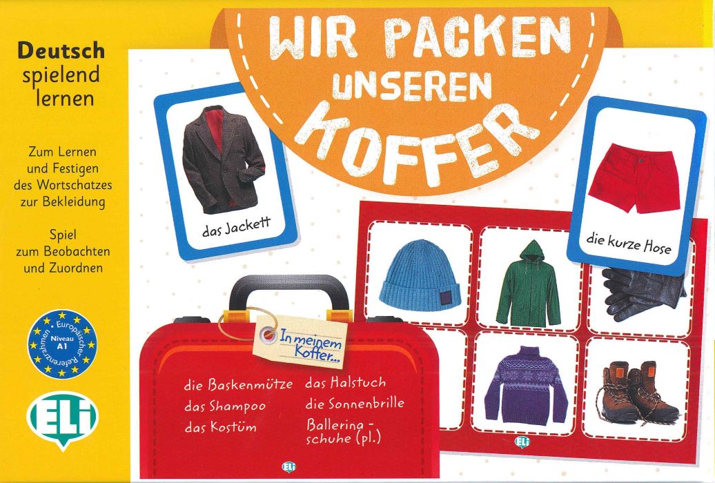 Wir packen unseren Koffer : Zum Lernen und festigen es Wortschatzes zur Bekleidung : Spiel zum Beobachten und Zuordnen. - Recanati : ELI srl, 2014. - 1 pudełko : 66 kart, 36 plansz (walizek) ; 21.5 cm x 14.5 cm + instrukcja.