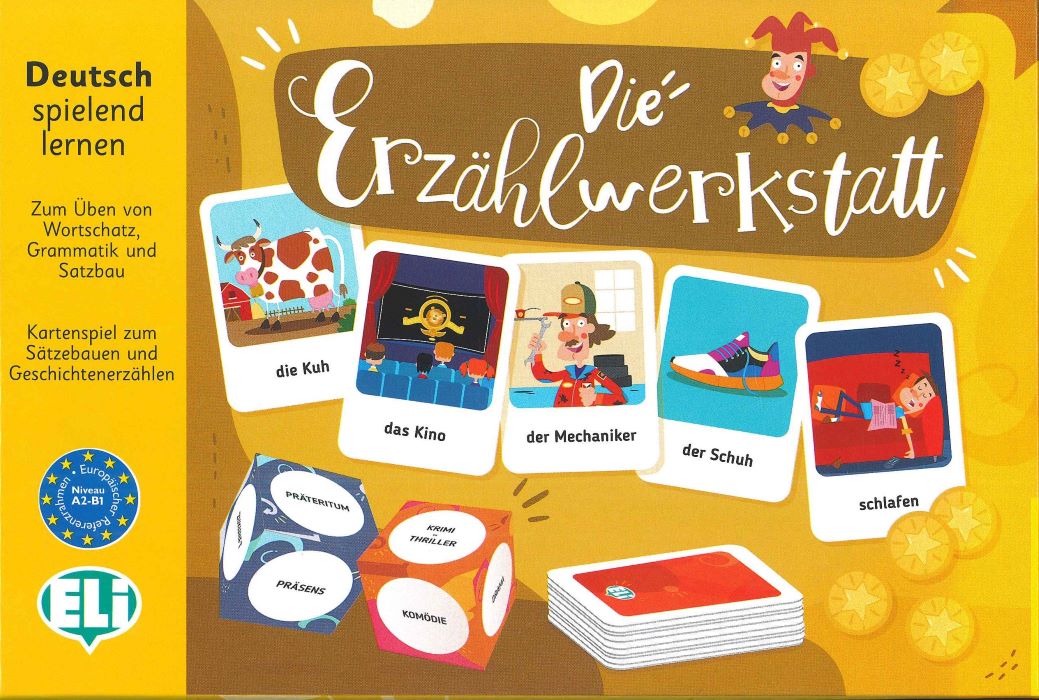 Die Erzählwerkstatt : Zum Üben von Wortschatz, Grammatik und Satzbau : Kartenspiel zum Sätzebauen und Geschichtenerzählen. - Recanati : ELI srl, 2021. - 1 pudełko : 132 karty, 2 kostyki do gry, 60 żetonów ; 21.5 cm x 14.5 cm + instrukcjaw jezyku polskim i niemieckim.