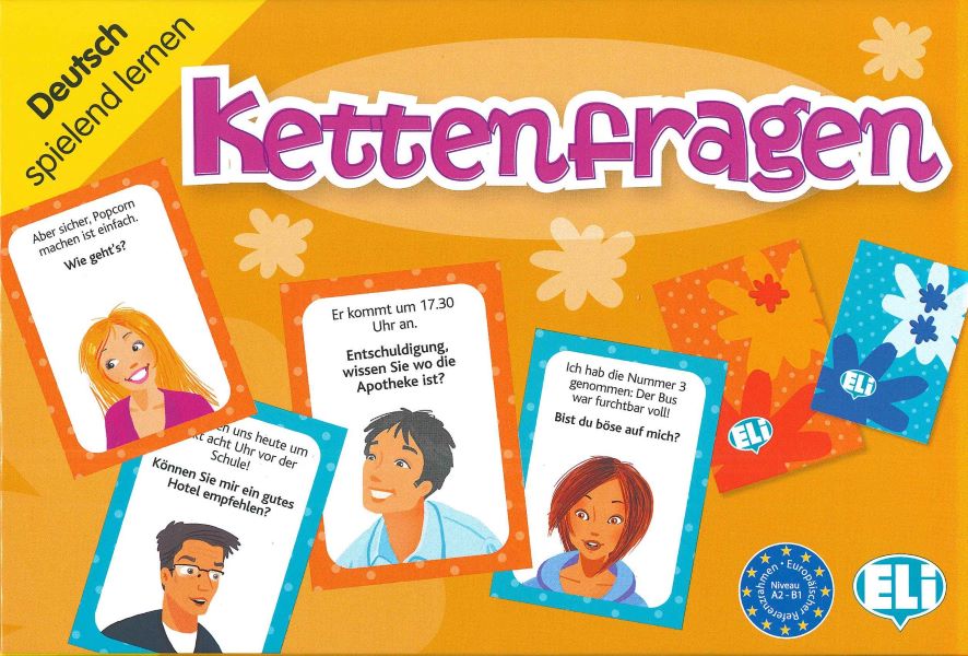 Kettenfragen : Deutsch spielend lernen. - Recanati : ELI srl, 2020. - 1 pudełko : 132 karty, 1 kostka do gry ; 21.5 cm x 14.5 cm + instrukcja.