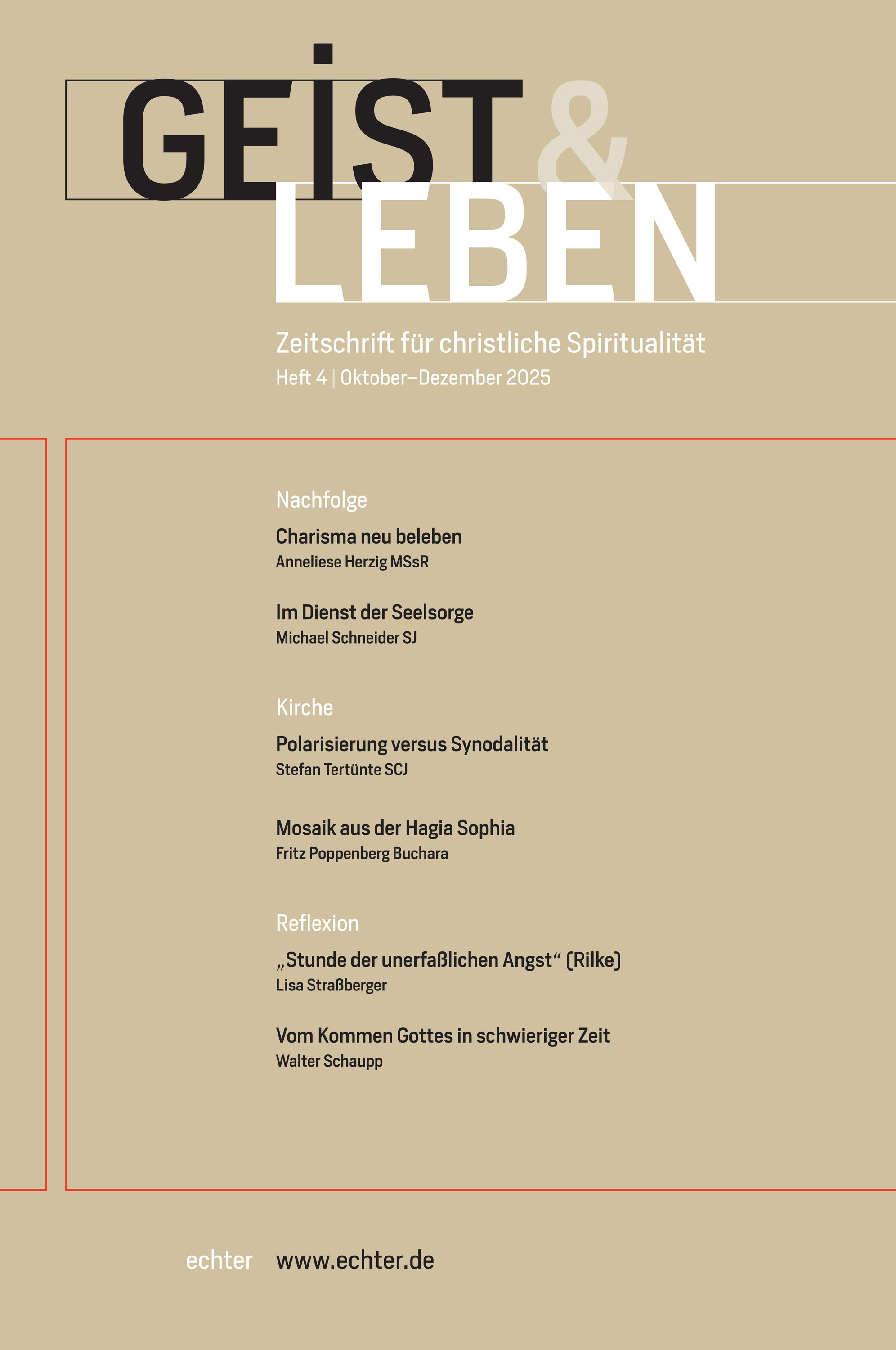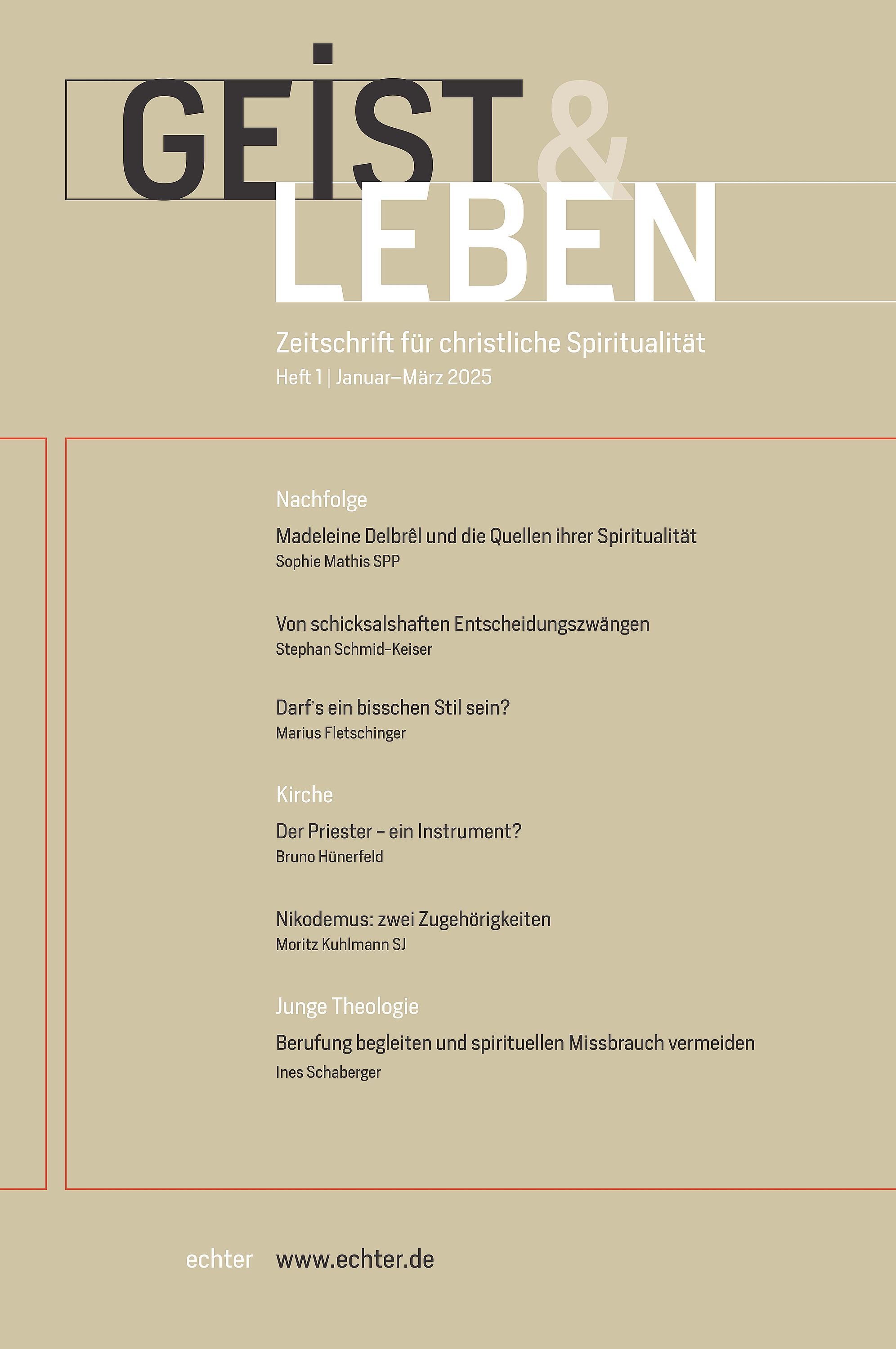 GuL 98 (2025), Heft 3 Juli-September 2025 n. 516 Notiz Christoph Benke Wenn der Boden schwankt [223-224] Nachfolge Raphaela Brüggenthies OSB Vigil [226-230] Michael Höffner Sakrament des gegenwärtigen Augenblicks. "Caussades" Alltagsmystik in theologischer Relecture II [231-238] Ulrich Hörwick Auf der Spur des homo religiosus. Zur spirituellen Verortung von Bergexerzitien [239-247] Bernd Aretz "Erscheitert" Gott? Kenosis und Kunst bei Klaus Hemmerle [248-256] Rob Faesen SJ Lektionen aus christlicher Mystik [257-265] Nachfolge | Kirche Andrea Schmuck Die Bologna-Entführung. Ein Krimi über Vertrauen als dialogische Ressource [266-272] Daniel Tibi OSB Kanonische Weisheit. Von der Spiritualität des Kirchenrechts [273-281] Nachfolge | Junge Theologie Wolfgang Sigler OSB Der Exodus als Streitgeschichte [282-287] Reflexion Christoph J. Amor "Alles ist durch das Wort geworden". Zugänge zur Lehre von der Schöpfungsmittlerschaft [288-296] Marc Pauly Verwandelndes Sprechen. Sprache als geistlicher Weg bei Eugen Rosenstock-Huessy [297-306] Siegfried Ringler Innovatives Mittelalter [307-315] Philippe Lécrivain SJ Geschichte und Theologie treiben mit Michel de Certeau (1925-1986) [316-322] Lektüre Buchbesprechungen [324-330]