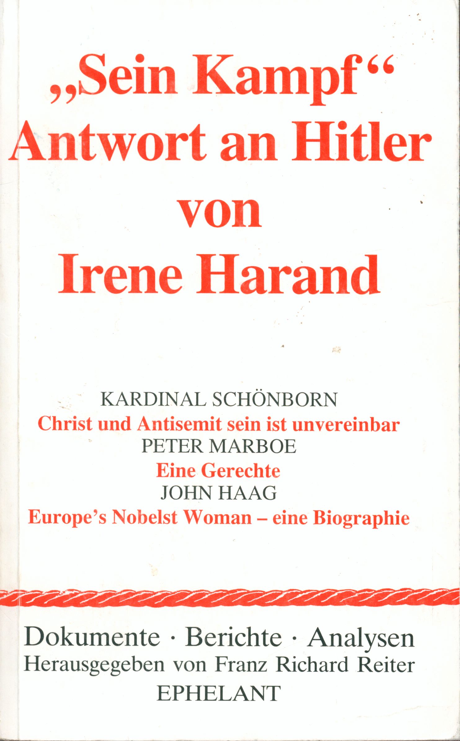 Irene Harand (1900, Wien - 1975, New York) gab in den 30er Taliren die Zeitschrift „Gerechtigkeit" heraus und gründete eine Bewegung gegen Rassenhass, Menschennot und Glorifizierung des Krieges. 1935 publizierte sie ihr Werk: „Sein Kampf, Antwort an Hitler von Irene Harand", eben Antworten auf Aussagen Hitlers und anderer Nazis - einfach, luzid, überzeugend, heute wie damals gültig und aufklärend. Das Buch wurde in Deutschland bald verboten. Mit dieser Neuauflage ist es seit 70 Jahren zum ersten ,Mal wieder verfügbar. „Der Nationalismus wirkt wie Gift,. wenn er der Jugend eingepflanzt wird, um ihren Hass gegen andere Menschengruppen zu entfachen. Ohne einen solchen Nationalismus gäbe es keinen Krieg." „Es ist kein Zweifel, dass die Welt krank ist. Wenn in unserer Menschengemeinschaft möglich ist, dass man Weizen verbrennt, Baumwolle vernichtet, Kaffee und sonstige Herrlichkeiten in das Meer wirft, die Anbauflächen verringert, Betriebe sperrt, während Hunderte Millionen von Menschen hungern, so ist es zweifellos, dass irgendein Fehler in dem Mechanismus der Weltwirtschaft besteht, der entdeckt und beseitigt werden müsste. ... Ich habe viel über die Sache nachgedacht und bin zur Überzeugung gekommen, dass das Problem der gerechten und vernünftigen Verteilung der Güter dieser Erde nicht unlösbar ist, wenn man den guten Willen aufbringt, auch denjenigen Menschen das Recht auf Leben zuzubilligen, die nicht mit Glückgütern gesegnet sind." Irene Harand