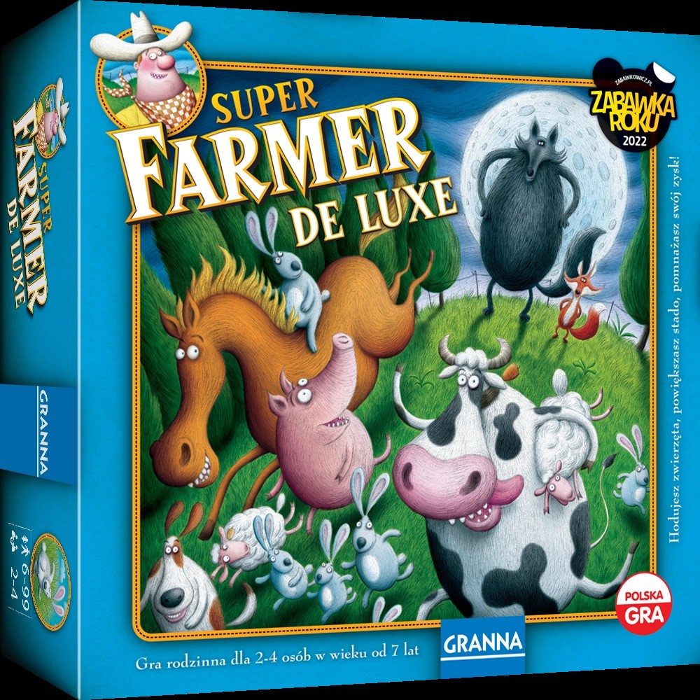 Superfarmer to wyjątkowa gra ekonomiczna znana już od kilkudziesięciu lat. Zostań najlepszym farmerem w okolicy i stwórz pokaźne stado zwierząt złożone z królików, owiec, świń, krów i koni. Ale uważaj! Na twoje zwierzęta czyhają wilki i lisy! Rozmnażaj i wymieniaj zwierzęta - trzeba wyczuć odpowiedni moment, aby wymienić zwierzęta po jak najbardziej korzystnym kursie. Jubileuszowe wydanie Superfarmera otrzymało nową oprawę graficzną z ilustracjami Piotra Sochy. Dodatkową atrakcją są plastikowe figurki psów i bardziej dynamiczna wersja gry. A wszystko w dużym kwadratowym pudełku! Gra uczy planowania, myślenia strategicznego i cierpliwości.