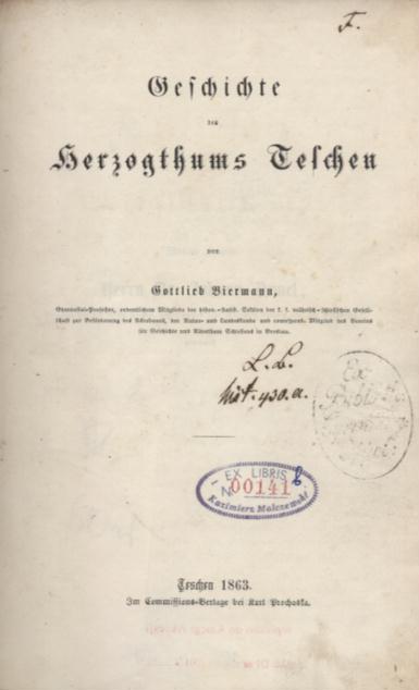 Geschichte des Herzogtums Teschen / Gottlieb Biermann. - Teschen : K. Prochaska, 1863. - XIX, 396 stron, [1] k. tabl. złoż. ; 21 cm.