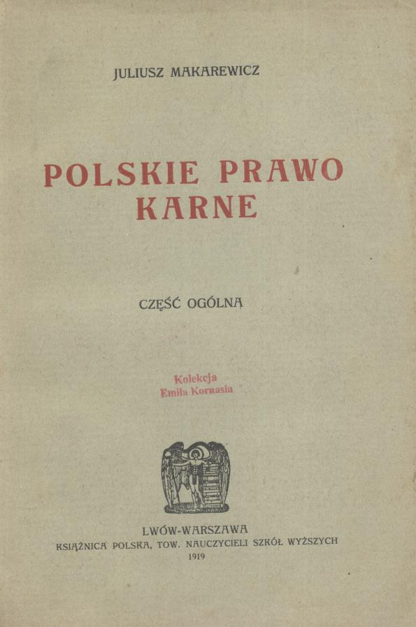 Polskie prawo karne : część ogólna / Juljusz Makarewicz. - Lwów ; Warszawa : Książnica Polska Tow. Nauczycieli Szkół Wyższych, 1919 (Lwów : Drukarnia "Grafja"). - VIII, [1], 379 s. : err. ; 23 cm.