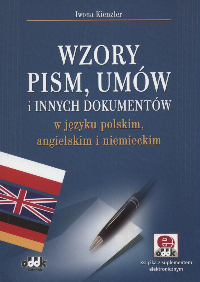 Wzory pism, umów i innych dokumentów w języku polskim, angielskim i niemieckim / Iwona Kienzler. - Wydanie 3. uaktualnione i uzupełnione - Gdańsk : ODDK, 2016. - 580 strony ; 24 cm.