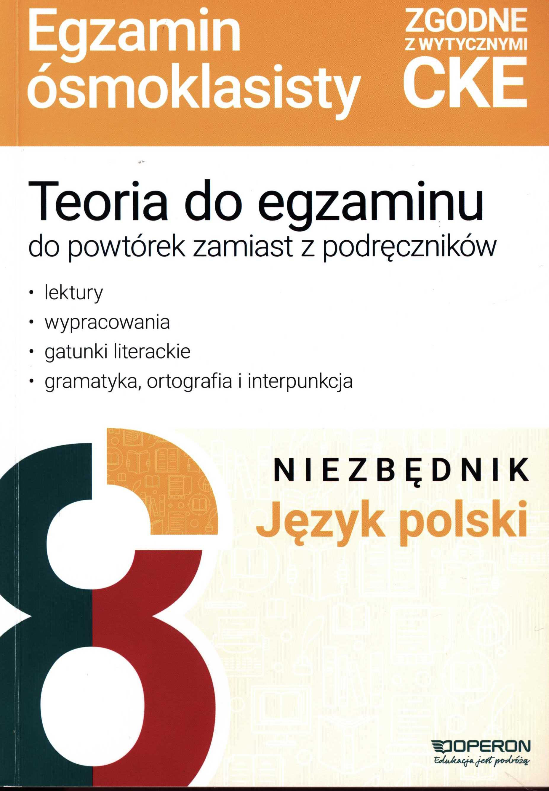 Na okładce: Teoria do egzaminu do powtórek zamiast z podręczników, lektury, wypracowania, gatunki literackie, gramatyka, ortografia i interpunkcja język polski, niezbędnik. Zgodne z wytycznymi CKE.