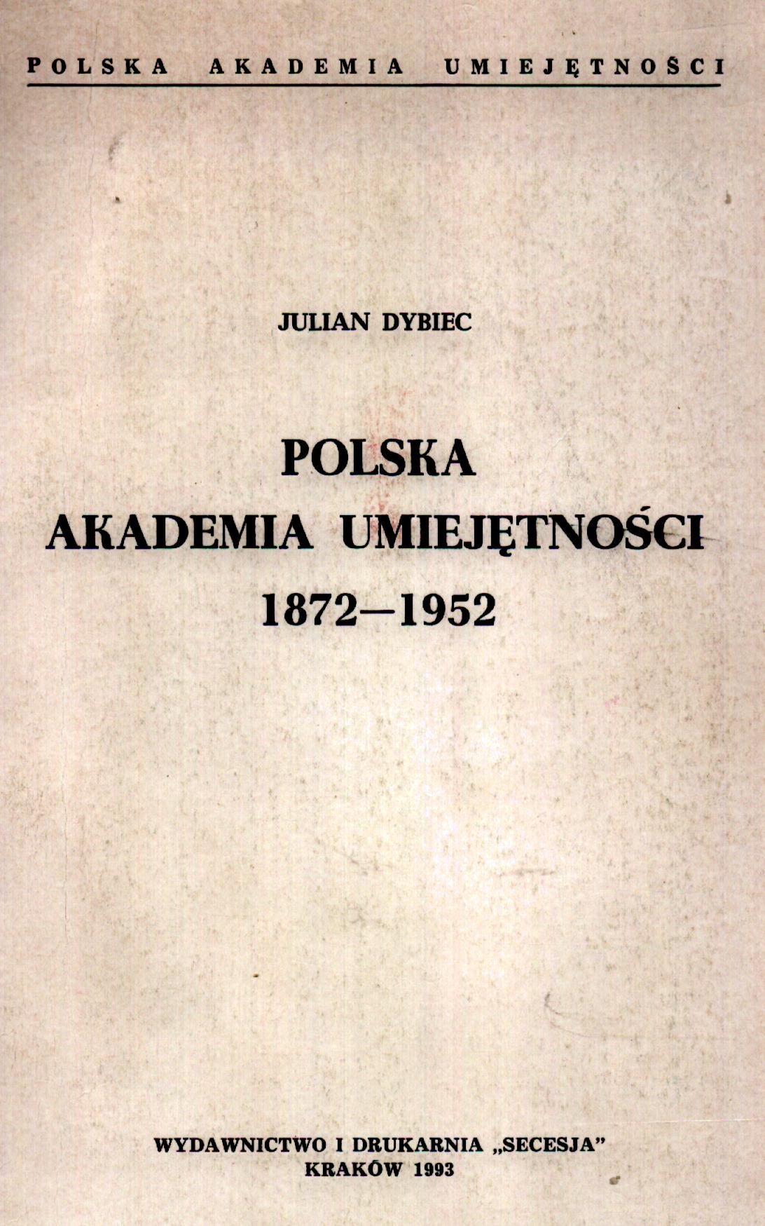 Polska Akademia Umiejętności 1872-1952 / Julian Dybiec ; Polska Akademia Umiejętności. - Kraków : "Secesja", 1993. - 124, [3] s., [16] s. tabl. : fot., portr., rys. ; 24 cm.