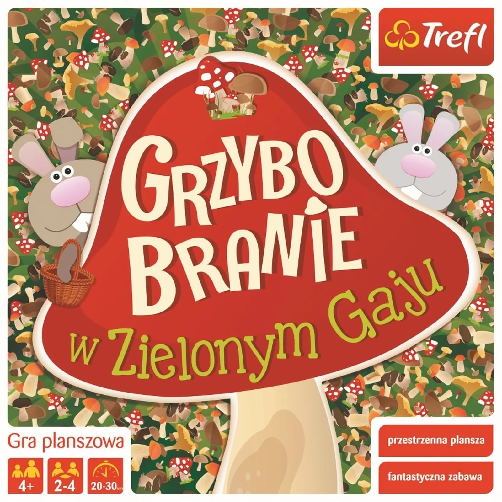 Zawiera: plansza wraz z elementami przestrzennymi, 4 koszyczki, 21 grzybów jadalnych, 5 czerwonych muchomorów, kostka do gry, instrukcja.