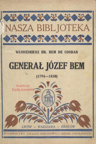 Generał Józef Bem (1794-1850) : szkic biograficzny w 75-tą rocznicę śmierci / Włodzimierz hr. Bem de Cosban. - Lwów [etc.] : Wydawnictwo Zakładu Narodowy im. Ossolińskich, 1925 (Lwów : Drukarnia Zakładu Narodowego im. Ossolińskich pod zarządem Józefa Ziembińskiego). - 57, [3] s., [4] k. tabl. : il., mapy ; 18 cm.