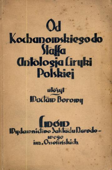 Od Kochanowskiego do Staffa : antologja liryki polskiej / ułożył Wacław Borowy. - Lwów : Wydawnictwo Zakładu Narodowego im. Ossolińskich, 1930 (Lwów : Druk. Zakład Narodowy im. Ossolińskich). - XL, 378, [1] s. ; 20 cm.