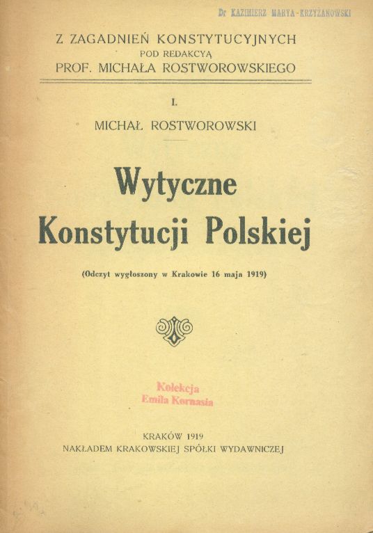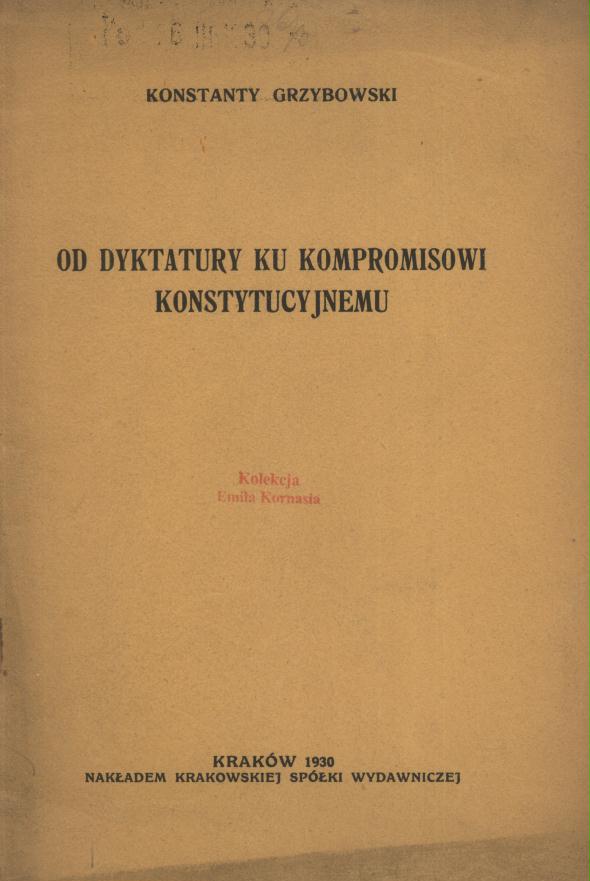 Od dyktatury ku kompromisowi konstytucyjnemu / Konstanty Grzybowski. - Kraków : nakładem Krakowskiej Spółki Wydawniczej, 1930 (Kraków : Drukarnia "Czasu" pod zarządem Leopolda Wójcika). - 32 s. ; 23 cm.