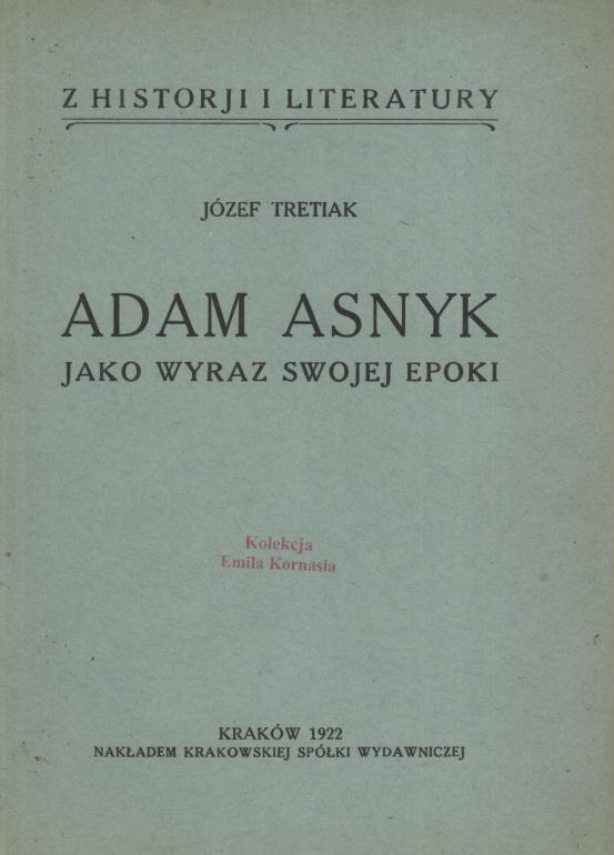 Adam Asnyk jako wyraz swojej epoki / Józef Tretiak. - Kraków : nakładem Krakowskiej Spółki Wydawniczej, 1922 (Kraków : Drukarnia Ludowa). - 66, [1] s. ; 21 cm.