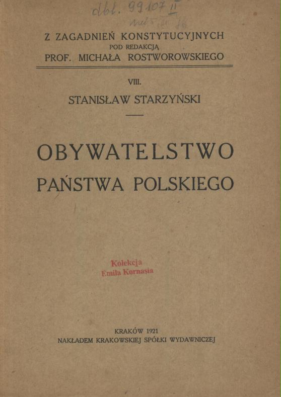 Obywatelstwo państwa polskiego / Stanisław Starzyński. - Kraków : nakładem Krakowskiej Spółki Wydawniczej, 1921 (Kraków : Druk W. L. Anczyca i Spółki). - 48 s. ; 21 cm.